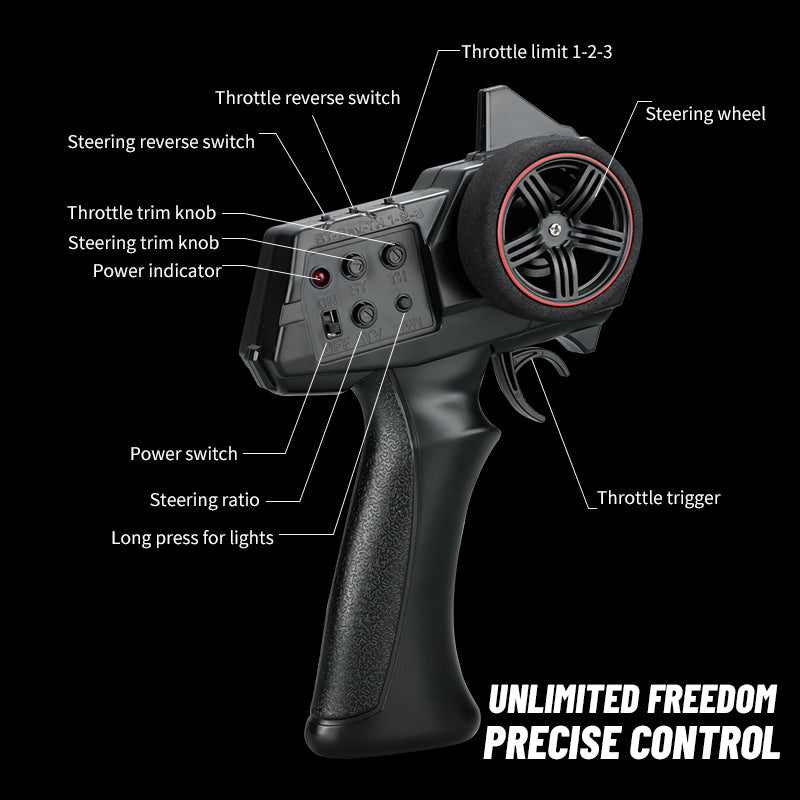 2.High torque external brushed motor combined with 20A waterproof brushed ESC for powerful performance.