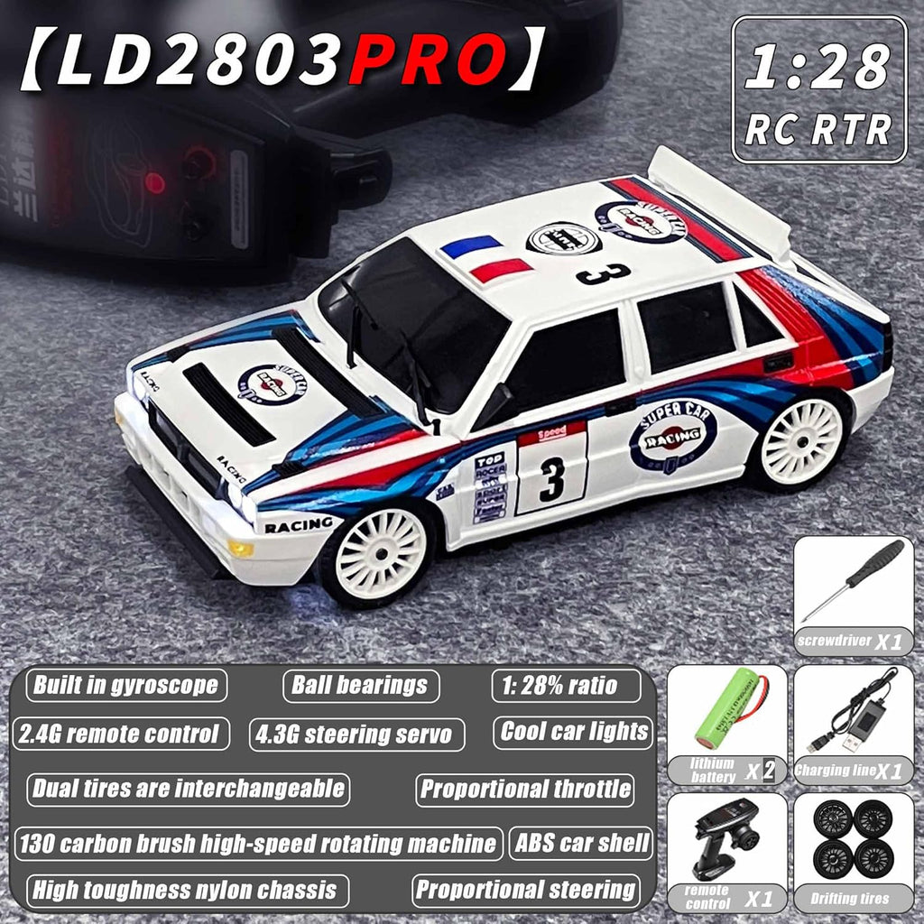 Features: Boutique drift, adopts multi-link design. The modeling is 1:28 to restore the real car, and the appearance is completed according to the actual proportion. 2.4G remote control, automatic frequency matching,racing tires, drift tires, full-proportional linear control throttle and steering, tire motor is with stall protection, full nylon frame, battery circuit board has overcharge, over discharge, low voltage protection